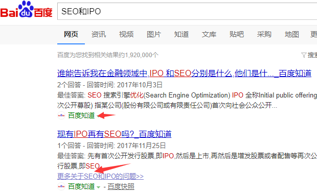 然后小编我,去点击了相关搜索中IPO和SEO,去看这个关键词的搜索结果页面,但奇怪的是,关于这个问题的,仅仅只有几个百度知道,有关于这个关键词的提问,,其他的都是一个分词匹配结果。