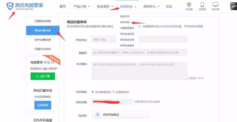 然后点击上图中的链接后,进到”误报网站申诉“填写网站相关信息: