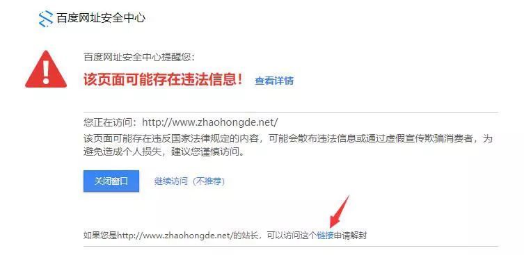 在确定自己网站已经清理干净后,直接点击提示风险的这行字进入百度网址安全中心: