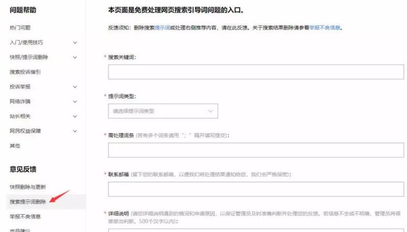 找到百度服务中心→百度搜索→搜索提示词删除(如图6),这里详细说明要重点写,还可以上传截图,如果有有力的反驳证据就提交吧。