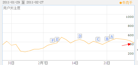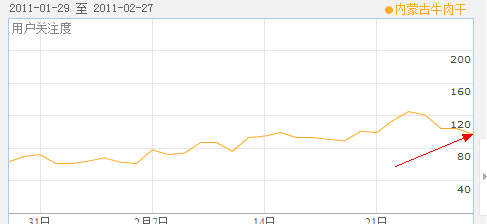后来,经常在淘宝买东西的朋友帮我在淘宝淘了几袋。(我本人不大喜欢逛淘宝,选择的过程比较花时间和心思)我想,想在网上买牛肉干,并且在百度搜索的用户,一定不止我一个,于是我在百度指数查看了下“牛肉干”的指数,