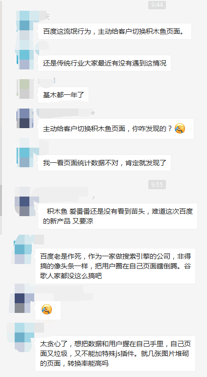 现在在一些微信群内用户怨声四起。其理由就是在不同客户的情况下,把广告主的网站主动切换到基木鱼平台。