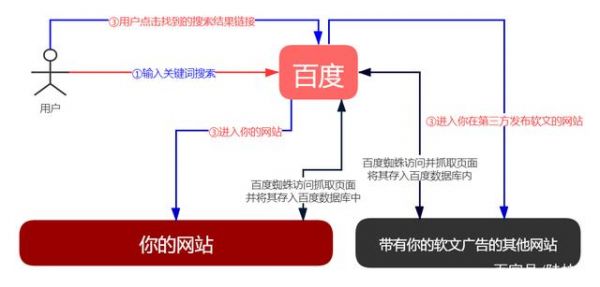 以百度搜索引擎为例,搜索引擎蜘蛛首先访问你的网站,上图中黑色箭头连线即是,然后将你的网站页面抓取回去放入百度的数据库内,再经过复杂的算法排序;用户在百度上输入一个关键词进行搜索,上面蓝色连线所示,百度会把数据库中的相关网页链接展现给用户,假设你的网站页面关键词排在搜索结果的第一页,那么用户会选择点击链接进入你的网站,也可能会点击带有你的软文内容的第三方网站。