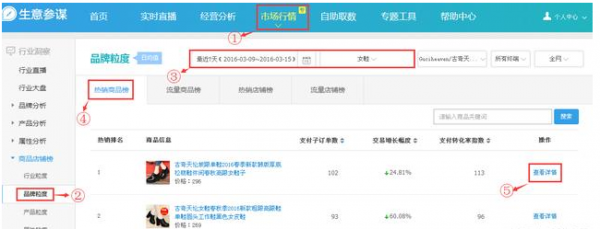 步骤2,我们打开生意参谋后台选择①市场行情—②在左边的商品店铺榜选择品牌粒度—③选择最近7天的数据—④我们选择女鞋下面的某个品牌按照所有终端,可以看到热销商品榜—⑤点选第一款宝贝查看详情,如图1-2所示