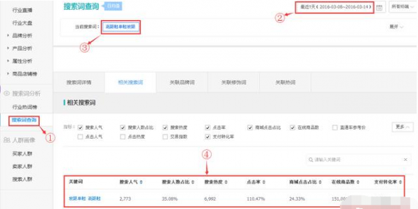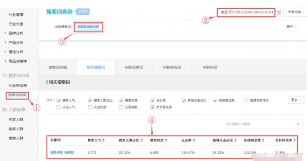 1)在生意参谋后台-专题工具-选词助手找到引流搜索词也就是淘宝搜索关键词,即顾客是通过哪些关键词进入店铺,看到女鞋。搜索关键词,进入此类说明关键具备一定的展现点击率。加入产品标题中,有助于增加排名展现量。