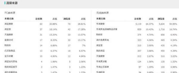 无线占比占比权重非常多,特别是手淘搜索5119在全部流量占比是65%以上(手淘搜索访客除以所有终端的访客数7934得出),这样,我们在无线端可以增加对有效关键词的数据采集及监控,增加关键词的精准优化,再次提高流量转化率的提升;其次在PC端流量来源入口比较少,虽然我们PC端的淘宝搜索和淘宝客也在合理的使用,可是流量的来源访客太少,必须加大投入了直通车推广,找到合适的关键词进行强推,而不是把PC端的来源忽略不计.