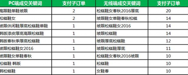 通过表格呈现的数据,我们可以“松糕鞋女春秋2016厚底”和“坡跟鞋女单鞋春秋”是竞争度匹配宝贝最好的关键词,在后期维护这个宝贝的时候,重点对这2个词精准营销.