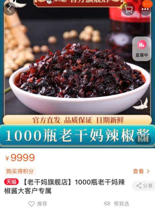 今日,老干妈淘宝官方旗舰店上架了一款名为“大客户专属”的 1000 瓶辣椒酱组合的产品,价格为9999元。此前,针对腾讯起诉老干妈乌龙事件,腾讯曾回应称:“一言难尽,并为了防止类似事件再次发生,以 1000 瓶老干妈为礼品向网友征求类似线索。”