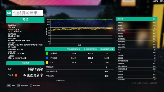 通过游戏中内置的性能测试结果,戴尔G5 游戏本在游戏开启超高画质情况下,成绩跑出了平均 84 帧成绩,要知道对于竞速类游戏而言,一帧的卡顿可能就会引起翻车事故,影响最终成绩,而在测试中,从帧率走势而言,戴尔G5 的性能发挥较为稳定,帧率也非常平稳,足以为玩家带来出色的游戏体验。