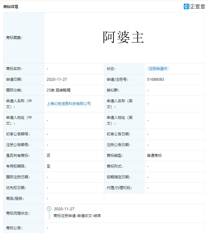 10 日消息 企查查 App 显示,近日,B 站关联公司上海幻电信息科技有限公司新增多条商标信息,其中一项商标名称为 “阿婆主”,申请 / 注册号为 51688083,商标分类为服装鞋帽,目前状态为 “注册申请中”。