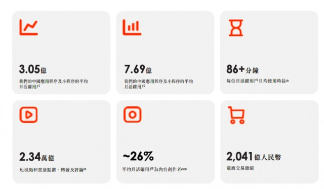 截至 2020 年 9 月 30 日的 9 个月内,快手的中国应用程序及小程序的平均日活跃用户为 3.05 亿,平均月活跃用户为 7.69 亿,快手应用上共开展近 14 亿次直播。截至 2020 年 9 月 30 日,快手应用上短视频库存累计约为 290 亿条。