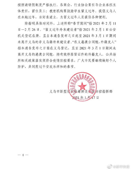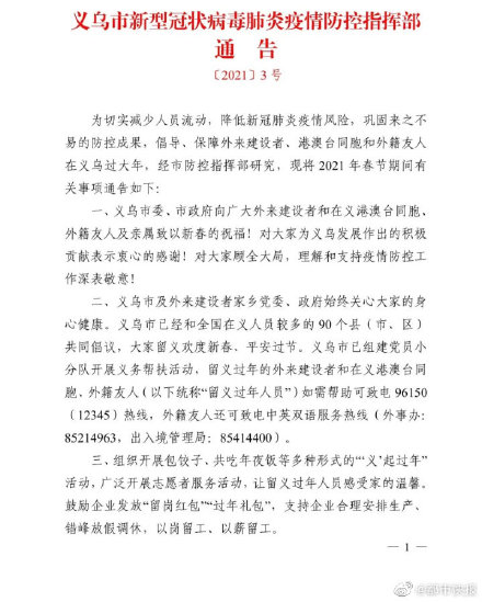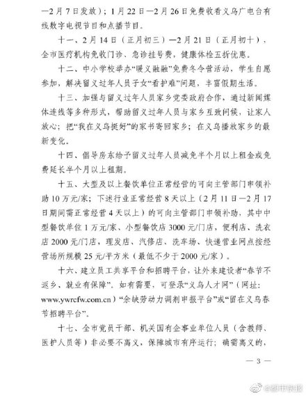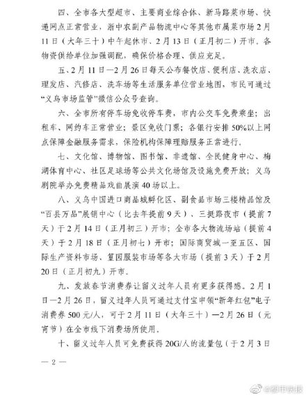 浙江义乌发布通告:2月1日-26日,留义过年人员可通过支付宝申领“新年红包”电子消费券500元/人,可于2月11日-2月26日在全市线下消费场所使用;可免费获得20G人的流量包,1月22日-2月26日免费收看义乌广电台有线数字电视节目和点播节目。此外,春节期间全市所有停车场免收停车费,#春节义乌市内公交车免费乘#;大型及以上餐饮单位正常经营的可向主管部门申领补助10万元/家等。