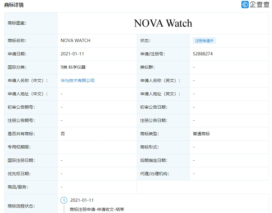 18日消息 感谢IT之家网友热心线索投递,华为在 1 月 11 日申请了一个 “NOVA Watch”商标,现处于申请中状态。