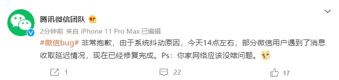 非常抱歉,由于系统抖动原因,今天 14 点左右,部分微信用户遇到了消息收取延迟情况,现在已经修复完成。