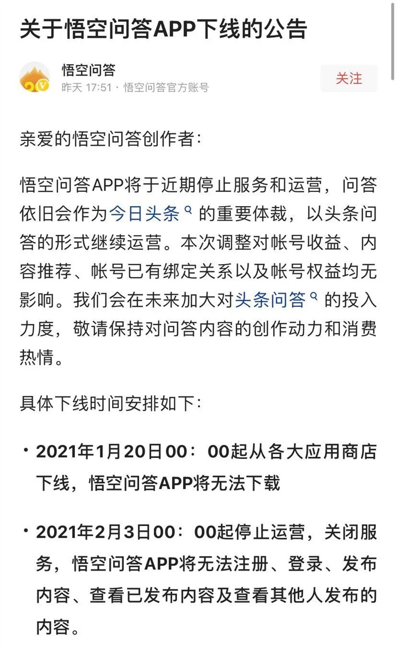 2021年1月13日,字节跳动旗下问答社区“悟空问答”发布了下线公告:从2021年1月20日零点起,悟空问答将从各大应用商店下线;2月3日起停止运营、关闭服务。