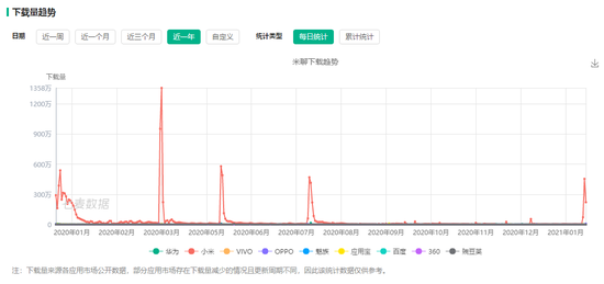 七麦数据的统计显示,近一年来米聊的安卓下载量只有在推出新版本时才会迎来一轮下载,平时基本处于沉寂状态。另外,米聊安卓平台的下载量也主要依赖小米。