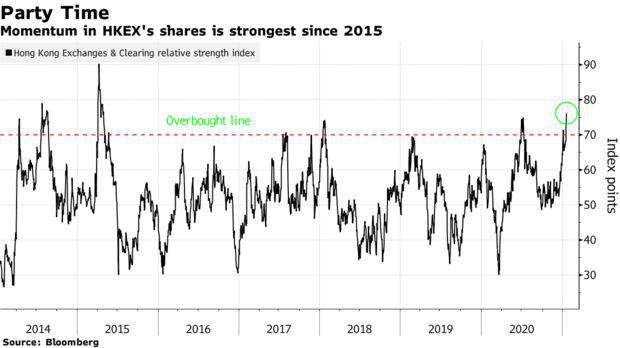 香港交易所成为了创纪录资金流入和交易活动激增的主要受益者。2020 年,香港交易所公司股价大涨 68%,而今年继续上涨约 20%。本周二,一项衡量交易动能的指标上升至 2015 年中国股市泡沫最严重时期以来的最高水平。