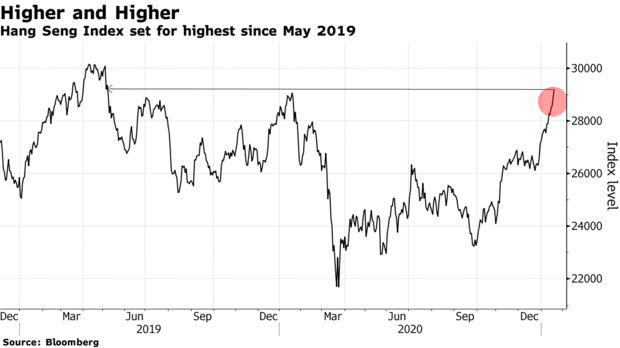在周二下午的交易中,恒生指数上涨 2.8%,超过去年的最高点。股票成交额达到 360 亿美元,创下自 2015 年以来最高纪录。在内地投资者的推动下,香港股市自 12 月下旬以来大幅上涨。