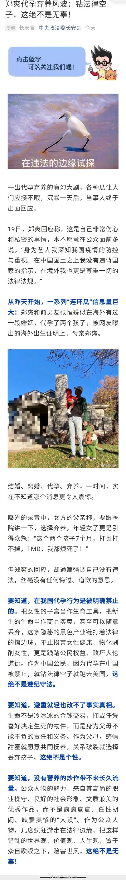 【中央政法委:郑爽代孕弃养钻法律空子,这绝不是无辜!】近日,某知名女星疑似代孕的消息冲上热搜,对此,今日中央政法委微信公众号发文评论称: