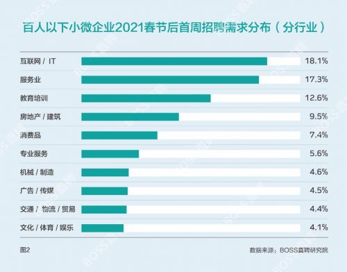 数据显示,2021年春节后首周,小微企业在节后首周便开始招兵买马,招聘需求占整体比例达到56%,需求高度旺盛。节后一周,在百人以下规模的小微企业中,来自互联网(18.1%)、生活服务(17.3%)和教育培训三大行业(12.6%)的招聘需求比例最高。