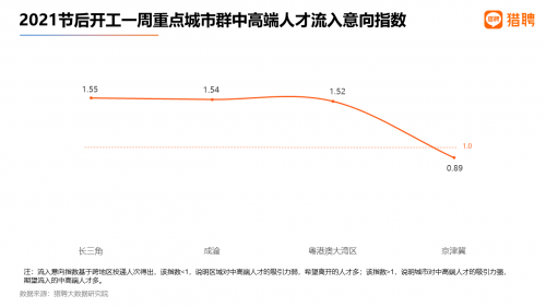 粤港澳大湾区、长三角、京津冀、成渝是国内较受关注的四大城市群,这四大城市群对中高端人才的吸引力如何?猎聘大数据显示,今年开工一周,中高端人才对长三角的流入意向最高,该指数为1.55;成渝、大湾区的流入意向指数为1.54、1.52,这表明外地向这三个城市群投递简历的人次高于这三个城市群向外地投递简历的人次,对人才吸引力较大。京津冀流动意向指数为0.89,小于1,表明向京津冀地区投递简历的人次低于京津冀人才向外地投递简历的人次,表明该地区对人才吸引力相对较小。