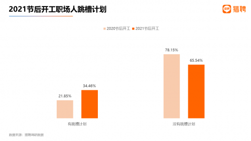 猎聘调研显示,今年春节开工有34.46%的职场人打算跳槽;而2020年开工后有21.85%的职场人打算跳槽。今年想跳槽的职场人比例明显高于2020年。