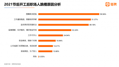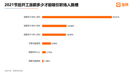 与此同时,2021节后开工想跳槽的人比例明显高于2020,想赚更多钱是跳槽最大主因。在想要跳槽的人中,53.01%的职场人表示,涨薪至少20%-30%才能吸引他们跳槽。