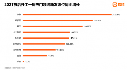 2021年开工一周,猎聘大数据研究院重点研究了在2020年发展较好的领域,如新能源、在线教育、AI、短视频、网络游戏、疫苗;也研究了在2020年受疫情影响较大的领域,如影视、餐饮、旅游领域,结果发现,这九个领域的新发职位都出现了不同程度的增长。