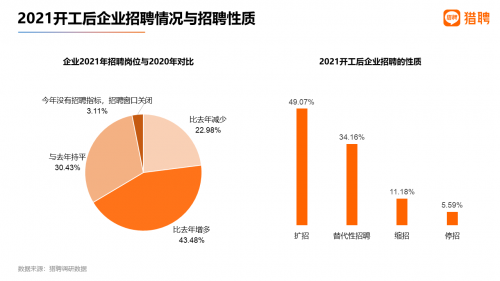 猎聘调研数据显示,43.48%的企业2021年招聘的岗位比2020年增多,30.43%的企业招聘岗位与2020年持平。此次调研发现,49.07%的企业招聘性质为扩招,34.16%的企业为替代性招聘,11.18%的企业为缩招,只有5.59%的企业今年停招。