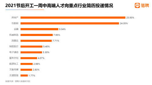 从今年节后开工一周中高端人才投递重点大行业的情况来看,投递房地产的人才最多,占比为25.93%;投递互联网行业的人才占比位居第二,为24.35%。