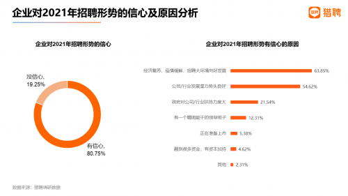 2、超8成企业对2021年招聘形势有信心,大环境向好是首要原因
