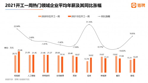 在这些领域中,企业平均年薪同比涨幅最高的是疫苗领域,2021节后开工其新发职位企业平均年薪为18.02万元,同比增长31.16%;其次是短视频行业,企业平均年薪同比增长22.84%。