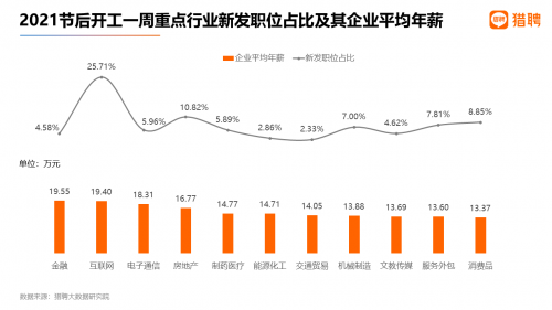 从今年节后开工一周重点大行业发布的新发职位占比来看,互联网占比最高,为25.71%;房地产位居第二,为10.82%;消费品位居第三,为8.85%。从各大重点行业的企业平均年薪来看,金融企业平均年薪最高,为19.55万元;互联网位居第二,为19.40万元;电子通信以18.31万的企业平均年薪位居第三。