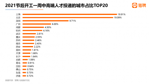 从节后开工一周中高端求职者投递的城市来看,投递上海、北京的人才占比最高,为19.91%、19.09%。投递深圳、广州的人才占比位居第三、第四,为9.71%、6.00%;投递成都、杭州的人才位居第五、第六,占比为4.50%、4.16%。