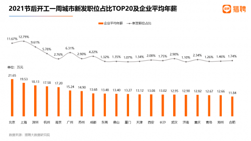 2021春节后开工首日过半企业到岗率超90%,远高于2020;2021节后开工一周新发职位同比增长266.58%,活跃人才增长69.54%。其中,互联网行业新发职位居全行业之首,占比25.71%,金融行业企业平均薪资最高,达到为19.55万元。另外,从不同城市的企业平均年薪来看,位居前五的依次是北京、上海、深圳、杭州、南京,分别达21.65万元、19.53万元、18.13万元、17.58万元、17.20万元。