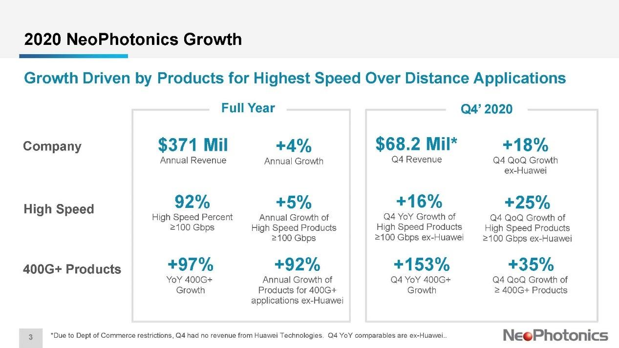 新飞通也在财报中列出了不计入来自华为的收入贡献后,2020 年 Q4 营收环比增长 18%。综合 2020 年全年,对营收贡献超过 10% 的客户包括华为 (40%),Ciena(17%),Acacia(10%);如果不计华为,对营收贡献超过 10% 的客户包括 Ciena(29%),Acacia(17%),诺基亚 (11%)。