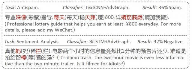 图:真实应用场景中的对抗文本(红色字体为变异词)