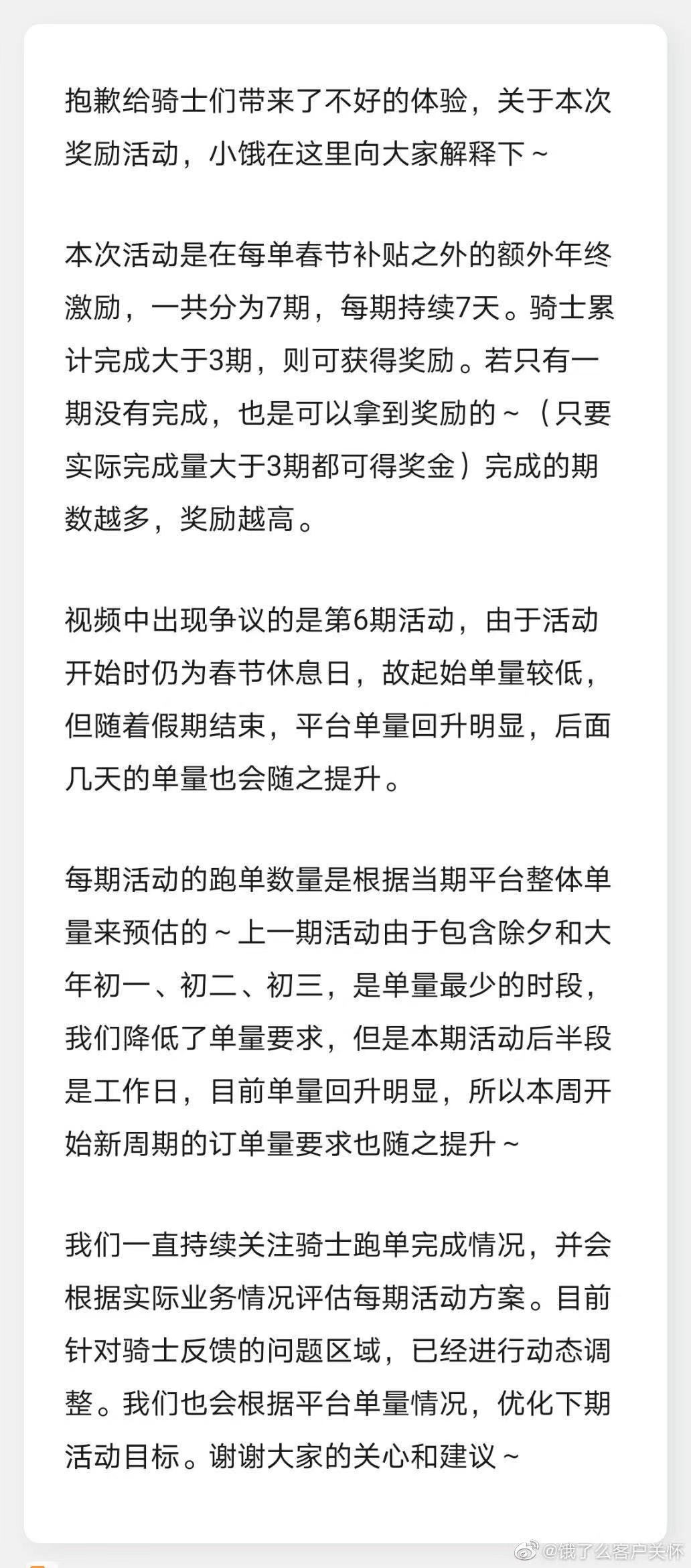 对此饿了么方面回应称,受到年节等多种因素影响,平台的日均单量原本就不同,年后订单量开始快速恢复,后面几天的骑手单量也会随之提升。此外,这一活动设置的单量原本就是浮动而非固定的。而对于第6期活动中要求单量数的猛增,饿了么方面解释,节前和节日期间单量较低,但随着假期结束和工作日的到来,平台单量回升明显,后续的单量也随之提升。