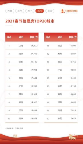 阿里影业旗下灯塔研究院《2021春节档市场数据洞察报告》显示,除78.22亿总票房成绩较2019年大增32.5%创下新纪录外,2021春节档同时凭借1.6亿总观影人次再创新纪录;票房排名前两位的影片《唐人街探案3》(35.5亿)、《你好,李焕英》(27.2亿),将八成票房揽入囊中。