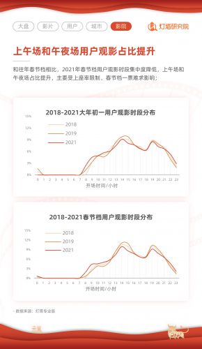 从用户数据来看,本届春节档,80%的用户仅观看1部影片;双人结伴观影占比较2019年春节档降低7%,单人和多人观影侧则均有提升。因影院上座率依旧有所限制、春节档影片一票难求,用户观影时段集中度较往期春节档有明显降低,14:00-15:00场次依旧是最受欢迎的观影时段,与此同时,上午场和夜场观影占比有所提升。