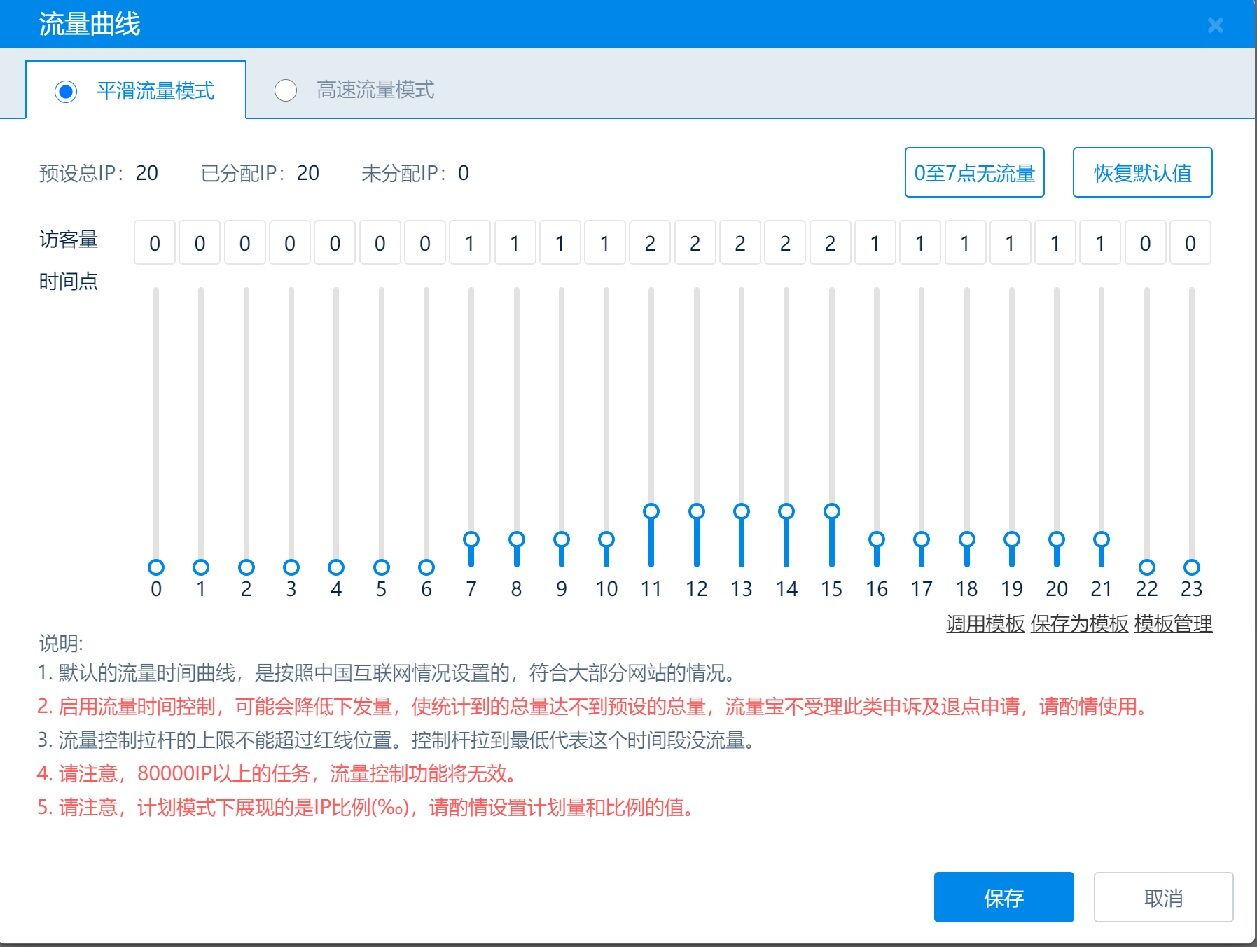 老铁流量宝时段控制策略功能上线,只要你将【关键词】预设大等于20,就可以使用流量策略控制,你可以手工调整某个时段的点击率,也可以使用默认值,还可创建自定义模板。总之,这个设计是为了方便站长进行流量压力测试,欢迎大家一起体验。