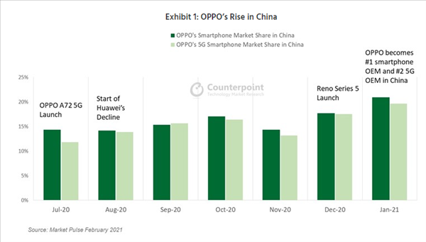 Counterpoint表示,在2020年第四季度,OPPO仅占中国市场份额的16%,位居vivo之后。
