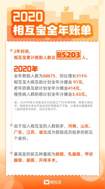 至此,2020年相互宝的大病互助计划的全年分摊金额也揭晓,全年总计为91元,低于年初预测的188元最高线。2年时间,相互宝成员累计救助人数达85203人。
