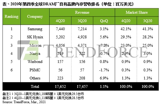 7日消息 TrendForce 集邦咨询本月发布了 2020 第四季度 DRAM 市场报告。报告显示,该季度 DRAM 总产值达 176.5 亿美元,季增 1.1%。整体市况归因于 2020 年第三季下旬华为被列入出口限制清单,使中国智能手机品牌 Oppo、Vivo、小米积极加大零部件采购力度,因而带动第四季各家 DRAM 供应商出货表现。然而受到库存调节的影响,DRAM 价格受到压抑,多数 DRAM 芯片制造企业 2020 年第四季营收表现与上季差异不大,仅美光(Micron)由于受到 2020 年 12 月的地震和停电影响,第四季度产量和收益有明显下滑。
