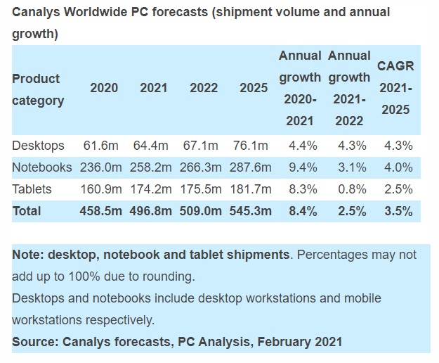 7日消息 市场研究机构 Canalys 近日发布了全球 PC 市场预测报告。报告显示,今年 Q1 电脑出货量的增长率同比将达到峰值,预计 2021 年全球 PC 出货量增长 8.4%,达到 4.968 亿台,笔记本、平板、台式机出货量均会增长。