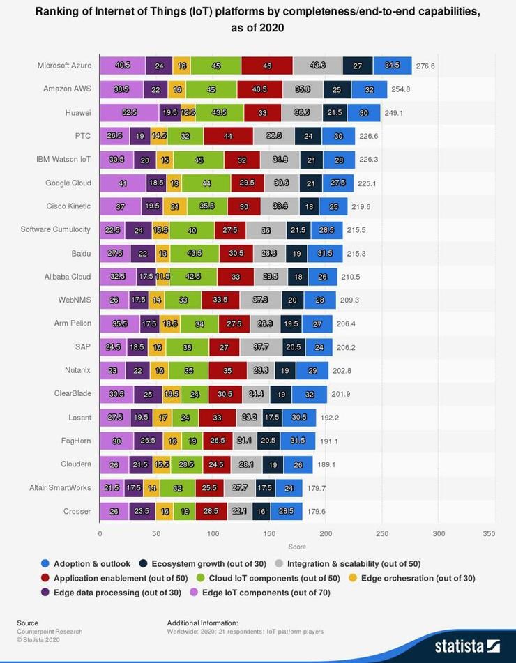 9、Counterpoint Research 数据显示,Azure 是端到端的全球领先物联网平台,总得分为 276。