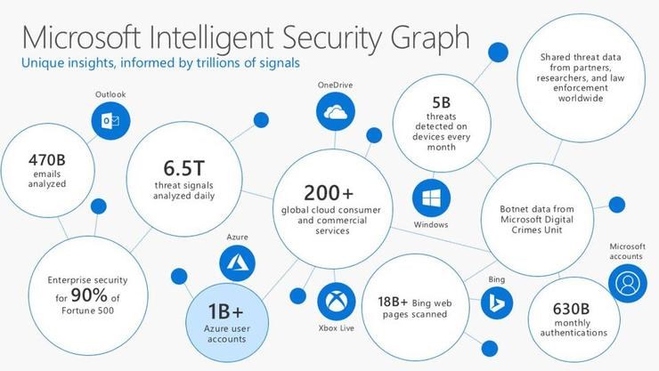 微软依靠 Security Graph 来了解云运行状态,包括安全登陆、身份验证以及异常行为。微软每月组织了超过 50 亿种不同的恶意软件威胁,从而挺了大量有用的数据来分析客户网络中的端点行为。