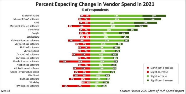 Flexera 技术报告显示,在接受调研的所有企业用户中,有 61% 的期望今年追加对 Azure 的使用,仅次于微软的 SaaS 软件。