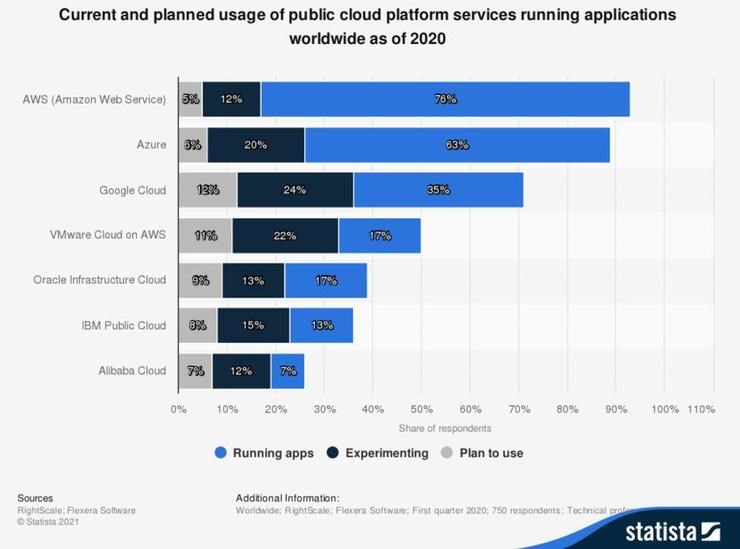 Statista 和 Flexera 2020 云使用情况报告显示,6% 的企业每年在 Azure 上的支出至少为 120 万美元。而从使用云和在云上运行虚机的企业数量来看,Azure 都在缩小与 AWS 之间的差距。