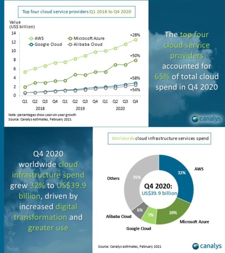 4、调研机构 Canalys 的数据显示,2020 年云基础设施服务的总支出从 2019 年的 1070 亿美元增长 33%,至 1420 亿美元,其中来自间接渠道的销售业务推动了近 20% 的市场份额的增长。